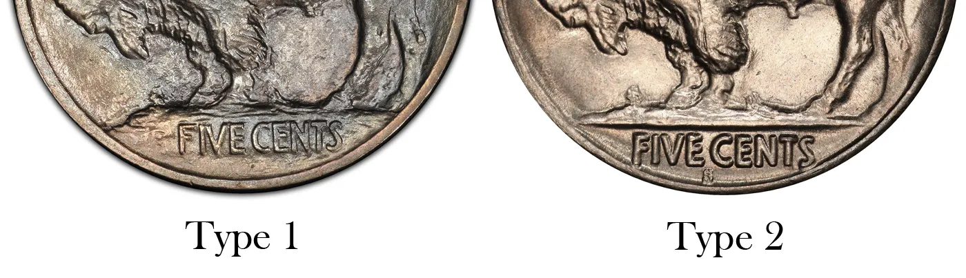 When determining which type of Buffalo nickel type you have you have to look at the reverse of the coin. On the type 1 design the Buffalo is standing on the mound where the type 2 has a mound but have a solid line under between the buffalo and the Five Cents towards the rim of the coin.