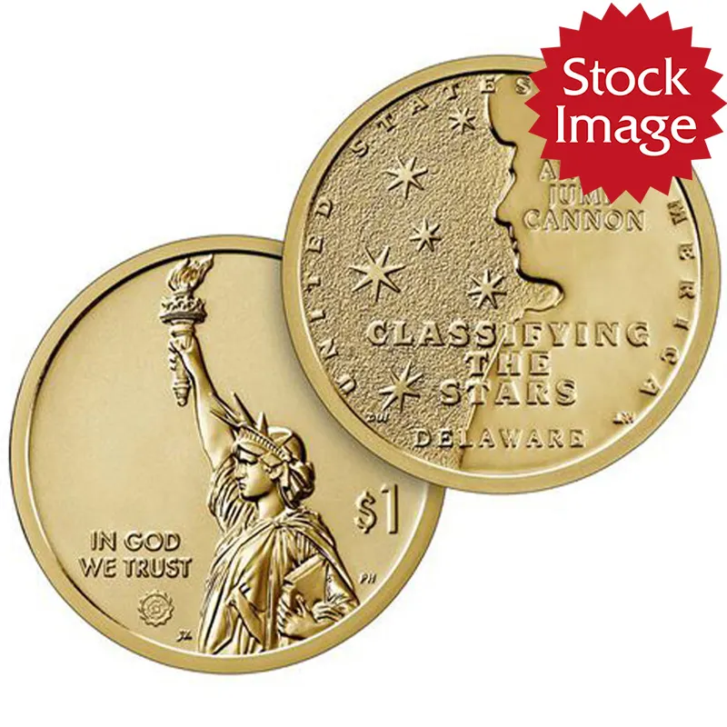 The American Innovation $1 Coin representing Delaware honors internationally recognized astronomer Annie Jump Cannon, who invented a system for classifying the stars still used today. Despite a hearing impairment, she advanced her education, gained recognition as a pioneer in science, and became the first woman to receive an honorary doctorate from Oxford University.