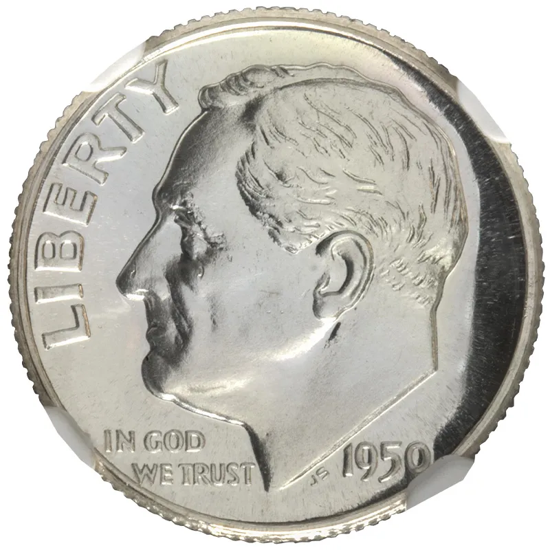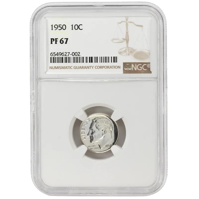 Discover the exquisite 1950 Proof Roosevelt Dime, graded NGC PF 67, a premium addition to any numismatic collection. This stunning coin is known for its impeccable minting quality and striking resemblance to the original designs crafted by John R. Sinnock. Struck in a highly polished finish, the 1950 Proof Roosevelt Dime showcases the iconic profile of President Franklin D. Roosevelt on the obverse, symbolizing leadership and resilience. The reverse features a vibrant depiction of a torch, olive branch, and oak branch, representing freedom, peace, and strength. With only a limited number of these high-grade examples available, this gem-quality dime is highly sought after by both collectors and investors alike. Don't miss the opportunity to own a piece of American history that reflects exceptional craftsmanship and enduring value.