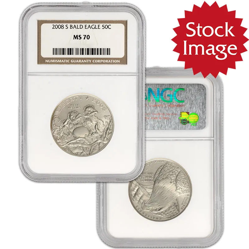 Introducing the 2008 S Bald Eagle Silver Dollar, graded NGC MS70, a remarkable commemorative coin honoring America's national symbol, the Bald Eagle. Struck at the San Francisco Mint, this stunning coin features exquisite detailing and flawless finishes, making it an exceptional addition to any numismatic collection or investment portfolio. Dated 2008, this Silver Dollar is not only a brilliant collectible but also a testament to American artistry and heritage. The coin is composed of 90% silver, ensuring its intrinsic value, while its perfect MS70 grade guarantees its quality and desirability among collectors. Secure this beautiful piece of history today and celebrate the spirit of freedom it represents.