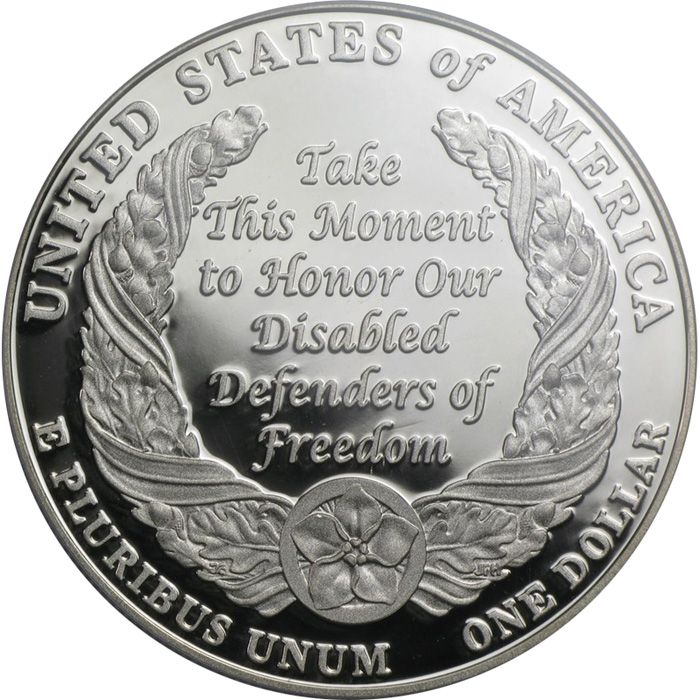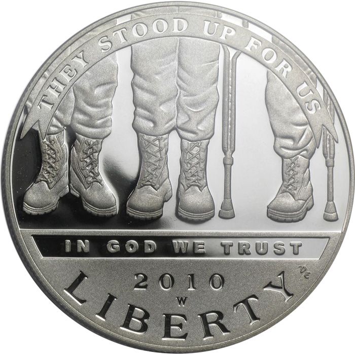 The American Veterans Disabled for Life Commemorative Coin Act (Public Law 110–277) authorizes the United States Mint to mint and issue silver one–dollar coins in commemoration of disabled American Veterans. The mintage limit for the 2010 American Veterans Disabled for Life Silver Dollar is set at 350,000 coins across all product options. Available options include proof and uncirculated versions of the coin, struck in 90 percent silver.