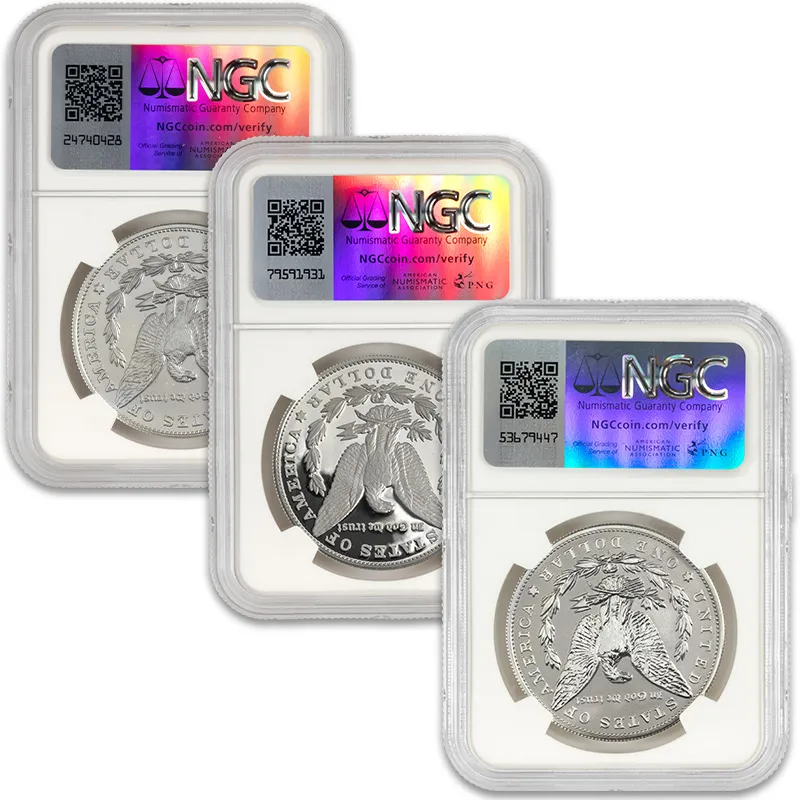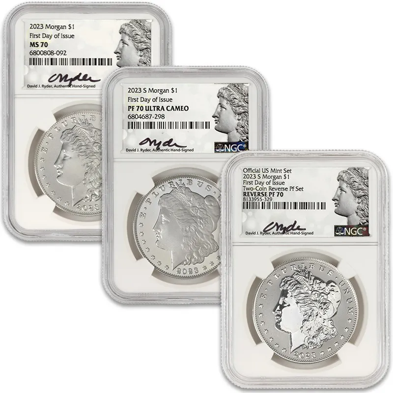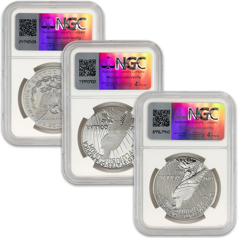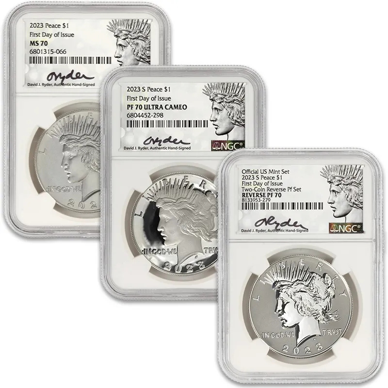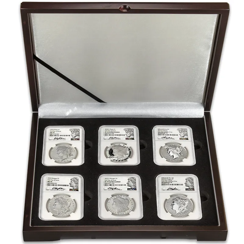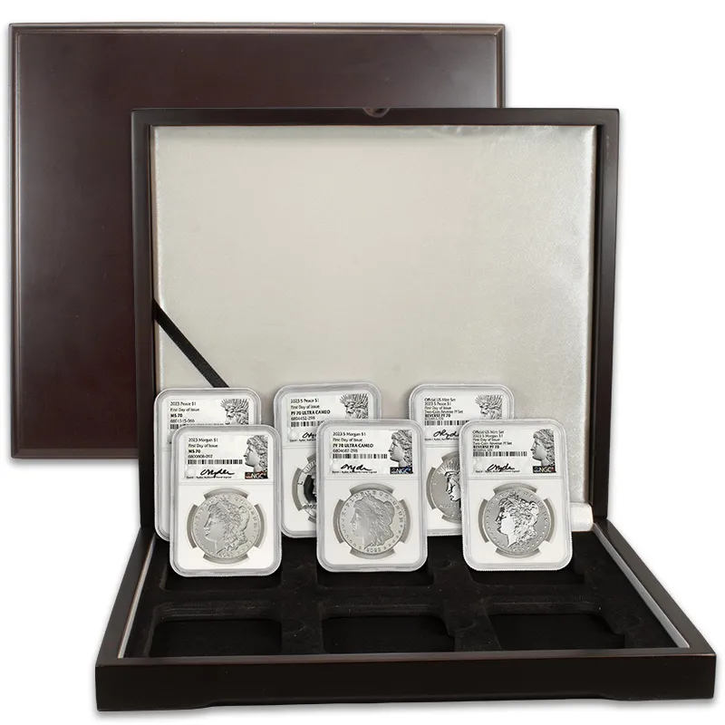 This complete six-piece set comprises a Morgan and Peace silver dollar coin with three different strikes. Each coin is certified in perfect 70 condition by NGC and has the coveted, limited edition Advance Releases designation. Each coin in this exquisite collection showcases the timeless designs that pay tribute to America's rich historical legacy. The Morgan Silver Dollar, first minted in 1878, represents a significant period in U.S. history, while the Peace Silver Dollar, introduced in 1921, symbolizes hope and prosperity following World War I. This 2023 release is struck in 90% silver and is sure to appreciate in value, representing a wise investment for both collectors and investors alike. Don't miss the chance to add this limited-edition set to your portfolio!