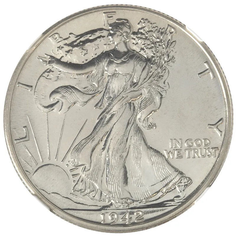 Discover the renowned 1942 Walking Liberty Half Dollar, expertly graded by NGC with a prestigious PF65 designation. This exquisite coin, minted during the height of World War II, features Adolph A. Weinman's iconic design, which showcases Lady Liberty striding confidently towards a bright future, embodying the spirit of America's resilience. On the reverse, the majestic eagle perched on a mountain represents strength and freedom, making this coin a meaningful addition to any collection or investment portfolio. Its pristine proof finish enhances its aesthetic appeal, making it a perfect choice for discerning collectors. Add a piece of history to your collection with the 1942 Walking Liberty Half Dollar, an emblem of both artistry and American heritage.