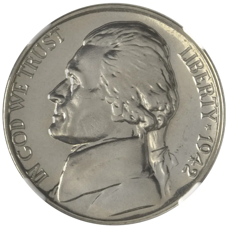 Discover this exquisite 1942 Jefferson Nickel graded NGC PF66, a stunning proof coin treasured by collectors and numismatists alike. Struck during a pivotal year in American history, this nickel showcases the remarkable artistry and craftsmanship of the U.S. Mint. The obverse features the iconic likeness of President Thomas Jefferson, while the reverse portrays his beloved home, Monticello. With its pristine, mirror-like surfaces and eye-catching details, this coin is an outstanding addition to any collection. Ideal for both seasoned investors and newcomers to the world of numismatics, the 1942 Jefferson Nickel NGC PF66 is a must-have for those seeking quality and historical significance in their coin collecting journey.