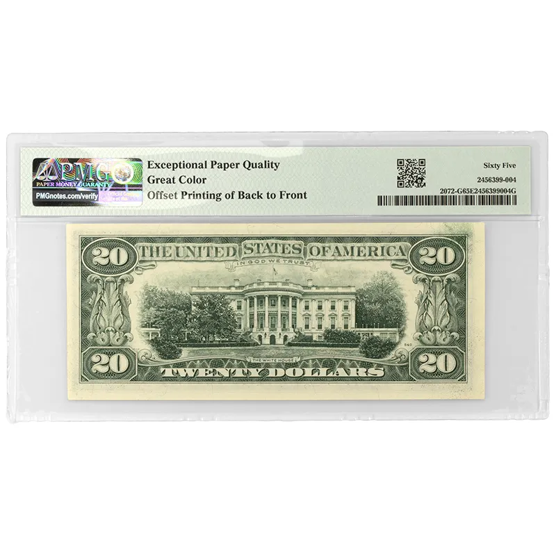 Discover a remarkable piece of numismatic history with the 1977 $20 Chicago Federal Reserve Note, expertly certified by PMG in Gem Uncirculated condition (65) with Exceptional Paper Quality (EPQ). Featuring stunning color and intricate printing details, this note is a standout for collectors and investors alike. What sets this specimen apart is its fascinating offset printing error, where the design is accidentally printed from back to front, creating a unique collectible value. This Federal Reserve Note not only reflects the artistry of currency design but also holds a significant place in the history of American paper money. Don't miss the chance to add this exceptional piece to your collection!