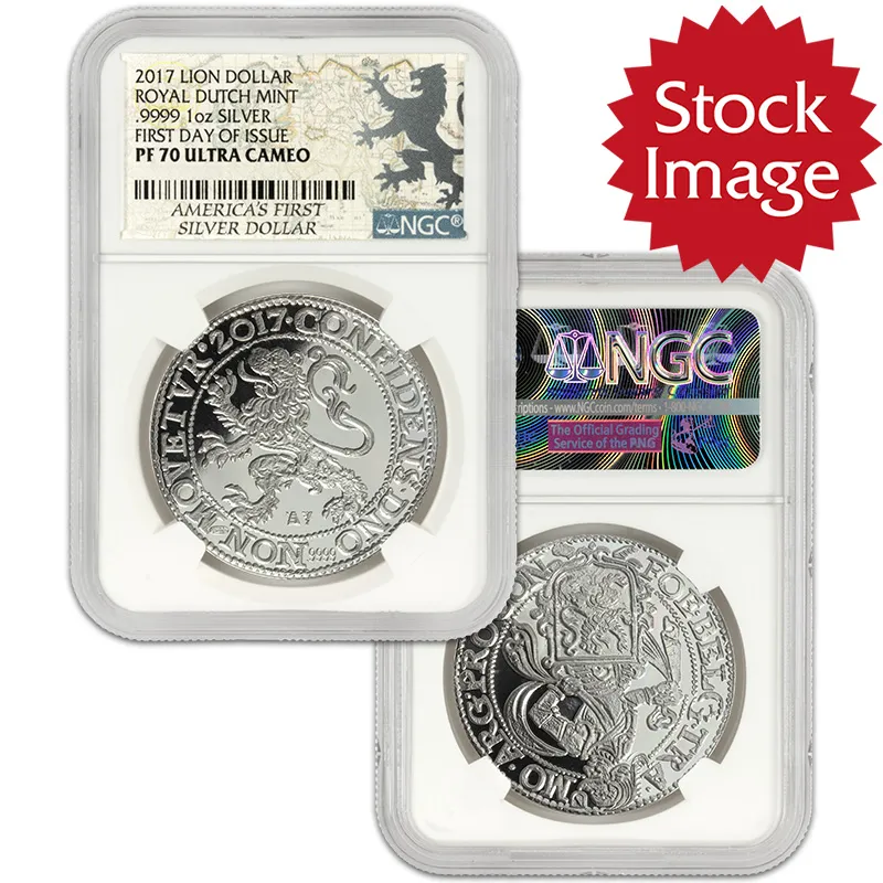 Discover the 2017 Netherlands Lion Daalder, a stunning tribute to Dutch numismatic history, now available in pristine Proof 70 Ultra Cameo (PF70UC) condition. This magnificent coin, minted to commemorate the Netherlands' enduring culture and proud legacy, showcases the striking lion emblem—a symbol of strength and sovereignty. Not only is this coin from the inaugural release day, making it even more special for collectors, but its flawless finish and exceptional detail highlight the craftsmanship of the Royal Dutch Mint. Ideal for serious numismatists and investors alike, this piece is a must-have addition to any collection, celebrating the rich heritage of Dutch coinage. Secure your 2017 Netherlands Lion Daalder today and own a piece of history!