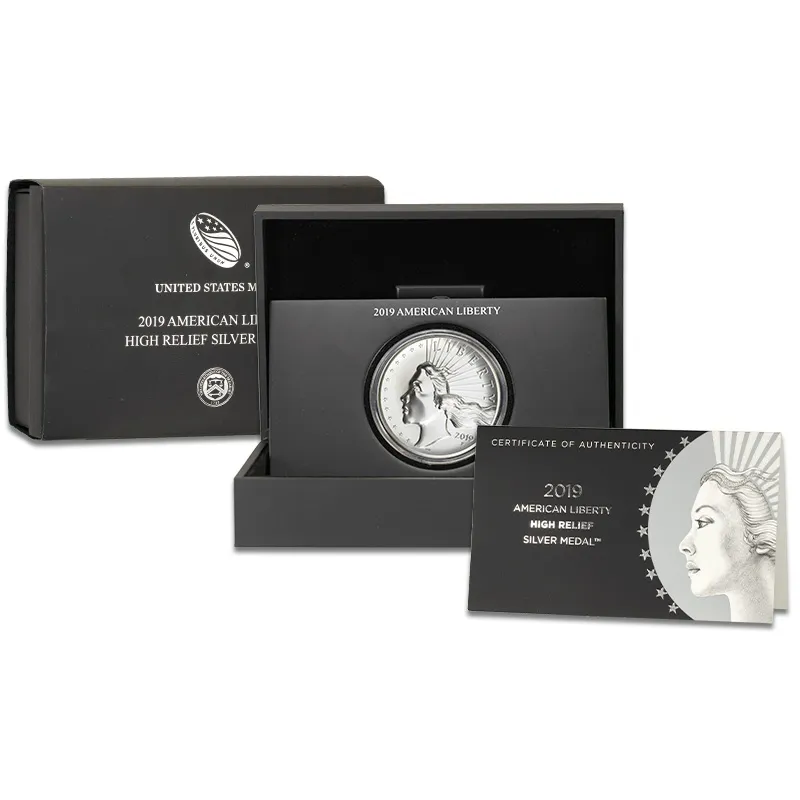 Discover the exquisite 2019 American Liberty High Relief Silver Medal, a stunning tribute to American values and history. This commemorative medal showcases the artistry and craftsmanship of the United States Mint, featuring an intricately designed high relief image of Lady Liberty, which stands as a beacon of freedom and democracy.