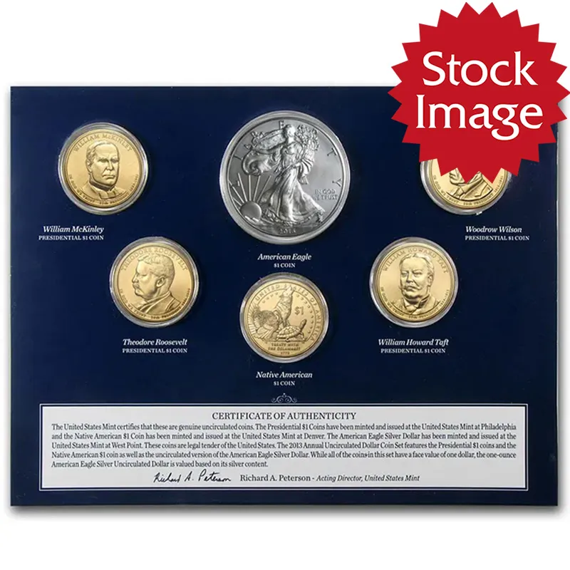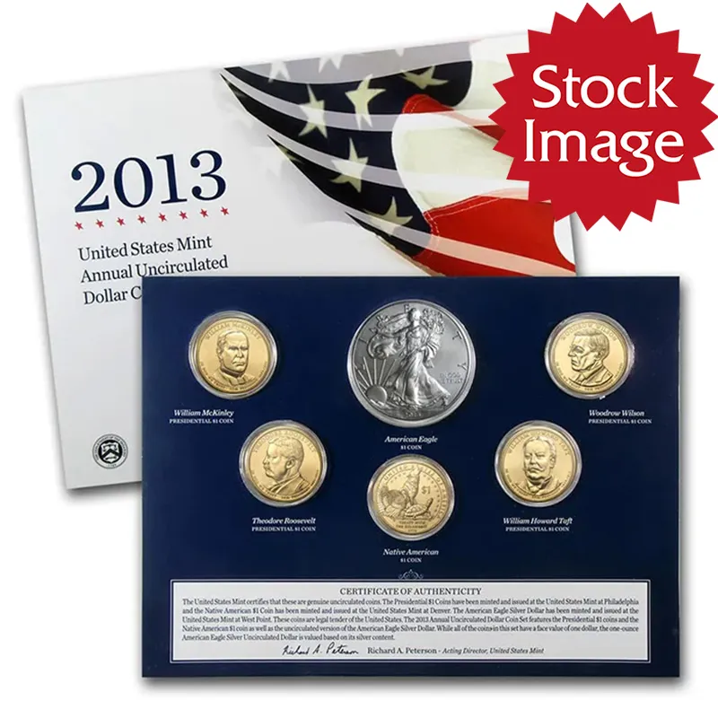 The 2008 Annual Uncirculated Dollar Coin Set contains all of the dollars for this year. These sets come packaged in a folder with each coin wrapped in a clear plastic pouch that can be rotated to make sure you coins can be rotated to the proper directions for display.