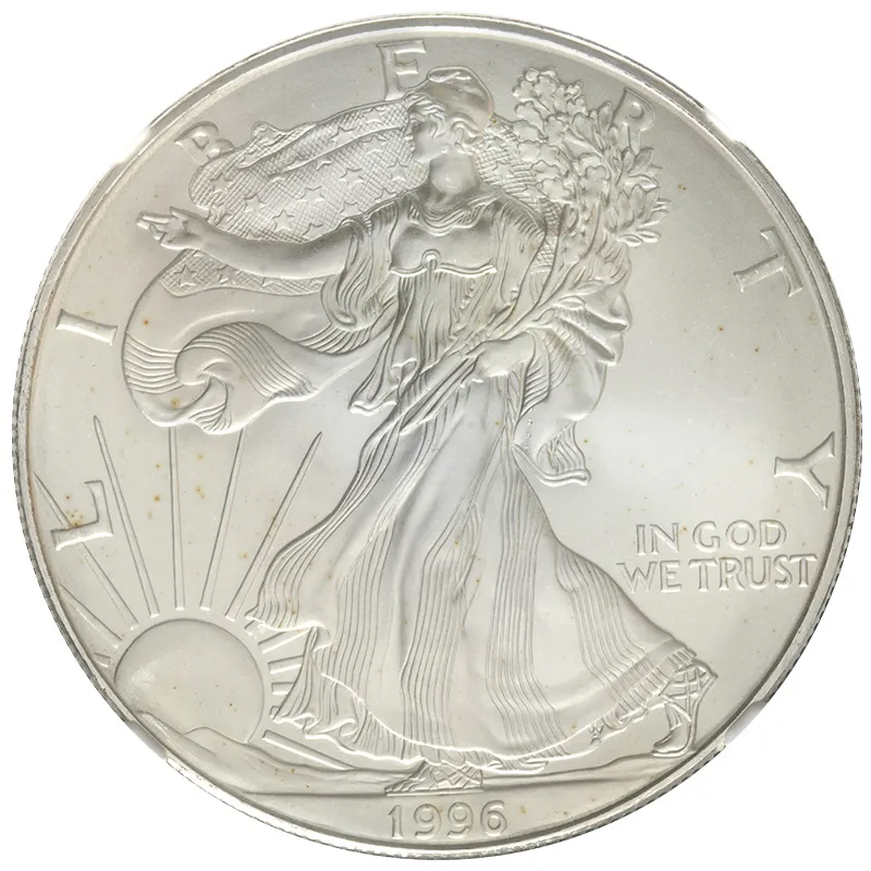 Explore the 1996 American Silver Eagle coin, proudly graded by NGC as MS69. This stunning bullion coin, struck by the United States Mint, features one of the most iconic designs in American numismatics, showcasing Adolph A. Weinman's classic Walking Liberty motif on the obverse and a powerful eagle on the reverse. Despite being classified as a 'Problem' coin due to minor imperfections, this piece remains a valuable addition to any collection or investment portfolio. The 1996 American Silver Eagle is a significant issue, marking a year of strong demand among collectors and investors alike. Don't miss the opportunity to own this exceptional piece of American history, representing 1 oz of .999 fine silver.