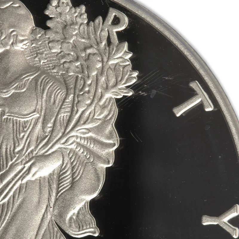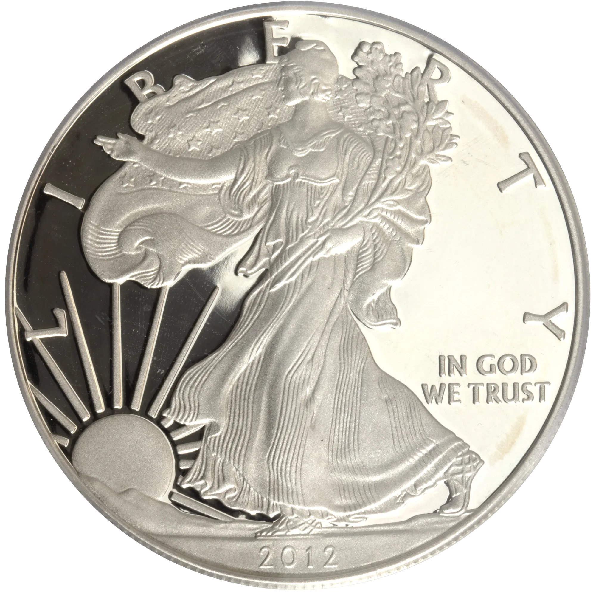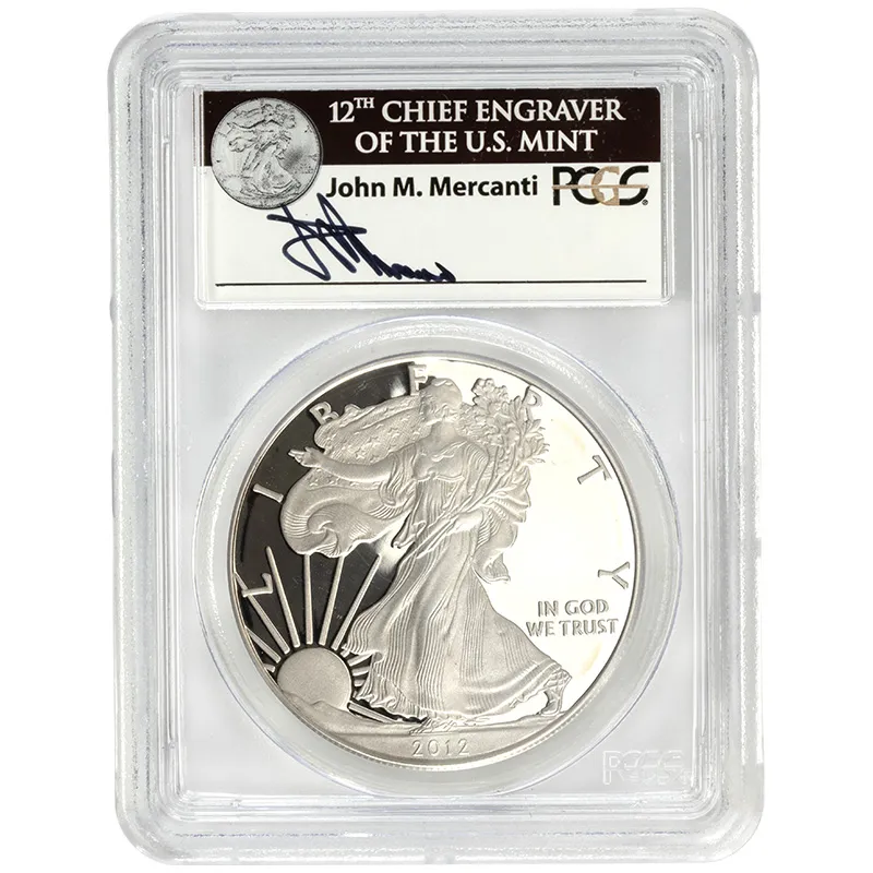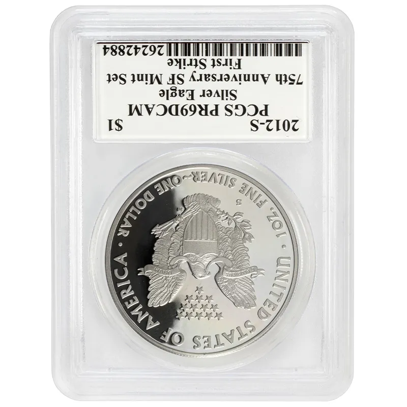 Introducing the 2012 S American Silver Eagle SF anniversary set, graded PCGS Proof 69 and recognized as a First Strike by the prestigious Professional Coin Grading Service (PCGS). This exquisite bullion coin features the iconic design by renowned Chief Engraver John Mercanti, showcasing Lady Liberty draped in the American flag, a symbol of freedom and hope. This particular specimen, while having some spots, maintains outstanding detail and brilliance, making it a worthy addition for any serious collector or investor. Don't miss your chance to own a piece of American numismatic history with this beautifully crafted 2012 Silver Eagle, perfect for enhancing your collection or as an investment opportunity. Secure this limited mintage coin today!