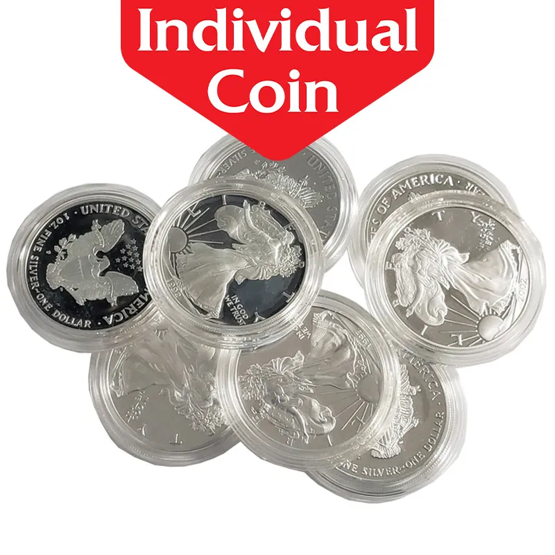 These American Eagle Silver Proof dollar coins have been produced each year by the United States government mint since 1986. Considered by many to be one of the most beautiful American coin designs, it is modeled after the old Walking Liberty half dollars. Each official US proof issued dollar coin contains 1 ounce of pure silver. This coin will come with the Proof Silver Eagle and the clear encapsulation only, and does not have the outer box or COA. These coins will have issues such as damage, stains, or milk spots.
