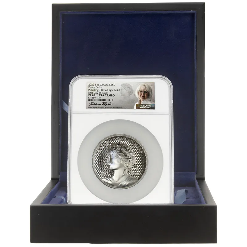 Explore the 2022 Canada $50 Silver Peace Dollar, a stunning piece of numismatic art crafted from 5 ounces of .9999 fine silver. This exquisite bullion coin commemorates the enduring symbol of peace and is a must-have for collectors and investors alike. The 2022 edition continues the legacy of the iconic Peace dollar, blending both historical significance and modern artistry in its design. With its impressive weight and purity, this coin not only exemplifies Canada's dedication to fine craftsmanship but also serves as a valuable addition to any silver investment portfolio. Secure your 2022 Canada $50 Silver Peace Dollar today and own a piece of history.