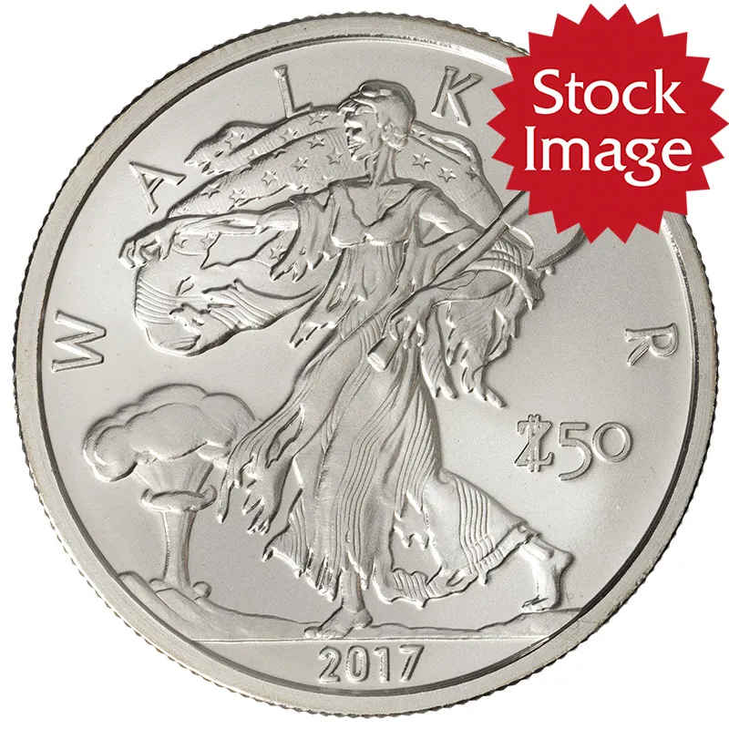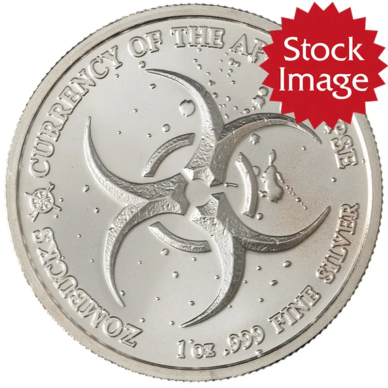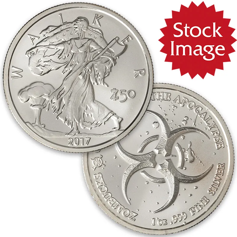 Honoring the famous Walking Liberty effigy from the Walking Liberty Half-Dollar and the American Silver Eagle, the Zombucks Walker is a zombified Walking Liberty reaching ahead for a human. She is wrapped in torn and disheveled clothing with an axe in hand, surrounded by stars and stripes and walking in front of a mushroom cloud. - Provident Metals